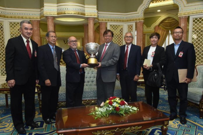 Chief Minister Datuk Patinggi Abang Johari Tun Openg handed the CM Cup to an SLTA delegation who paid a courtesy call on him at his office in the State Legislative Assembly (DUN) complex.