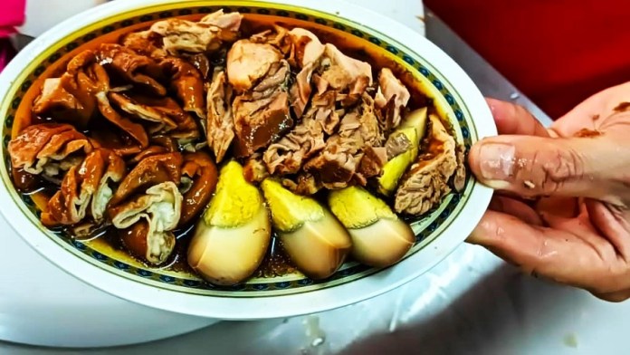 Apart from his signature pork leg rice, Tan’s cafe also offers ‘kueh chap,’ a dish he also makes, featuring broad flat rice sheets in dark broths–its incredients similar to those in pork leg rice.
