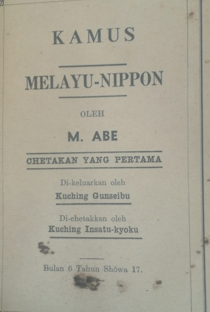 Kamus bahasa Melayu dan bahasa Jepun setebal 34 mukasurat dalam cetakkan pertama tersebut dikarang individu bernama M Abe dan dikeluarkan Kuching Gunseibu serta dicetak Kuching Insatu-kyoku.