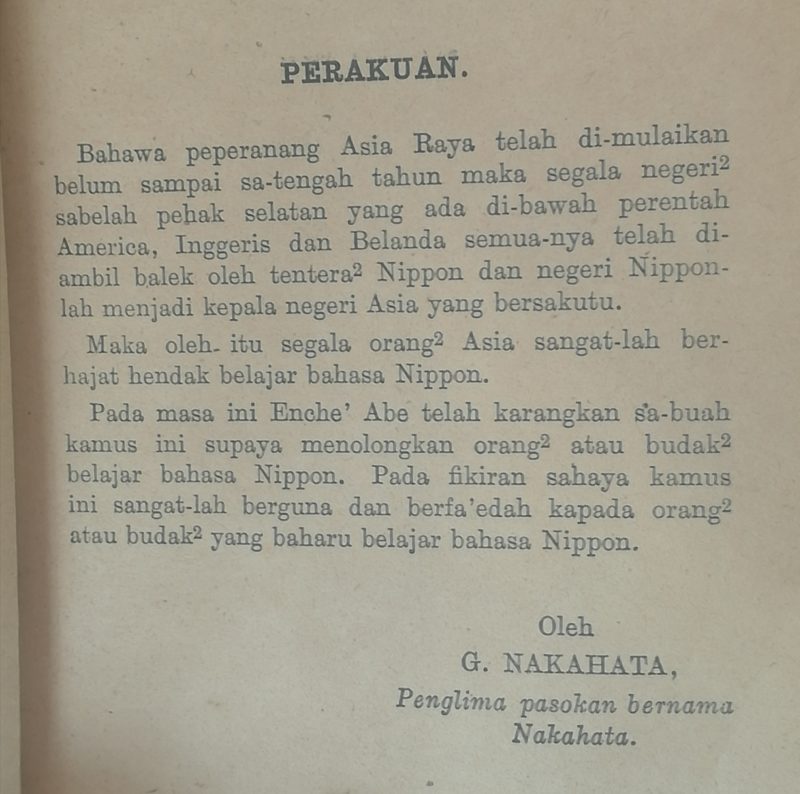 Berdasarkan halaman perakuan kamus itu, individu bernama G Nakahata mendedahkan setelah tentera Jepun menakluki negeri dikuasai Amerika, Inggeris dan Belanda di Selatan Asia, penduduknya digalakkan belajar bahasa Jepun.