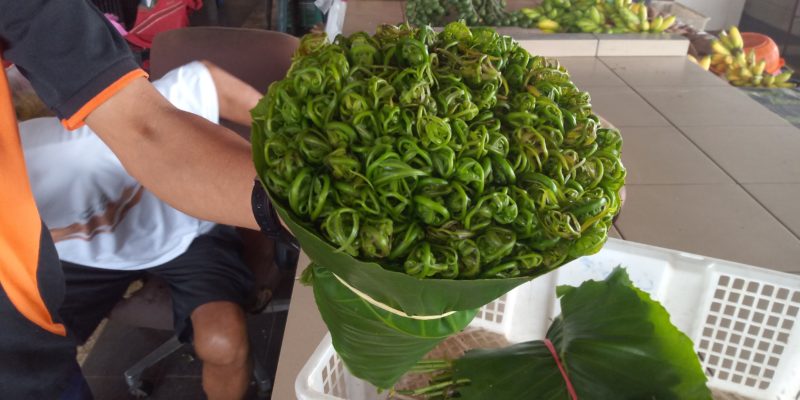 He wraps each bunch of ferns with ‘Buan’ leaves or Dillenia leaves and sell them for between RM2 and RM3 each, depending on grade — B or C. Grade A ones are usually sold to restaurants for a very good price, up to RM15 per kilo.