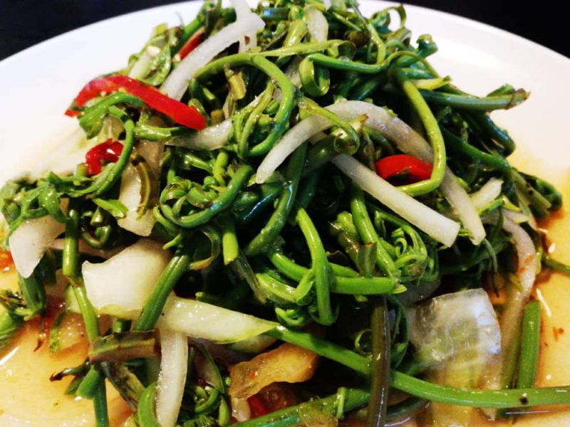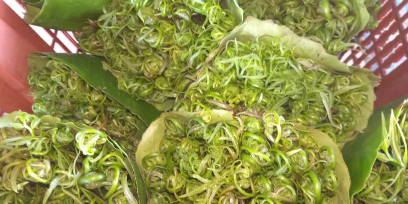 George said his favourite recipe in cooking midin is putting them into a pot of boiling water that has a mixture of ginger, garlic and small fried fish (or dried fish such as ‘Salai Lajong’). Just add a bit of salt for taste.