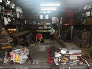 While admiring the mural and appreciating the story, listen carefully and walk down towards the sound of metal clanging, clattering and tinkling to find skilled craftsmen sitting on low stools and busy at work, even on the five-foot way, in crammed and cluttered shops.